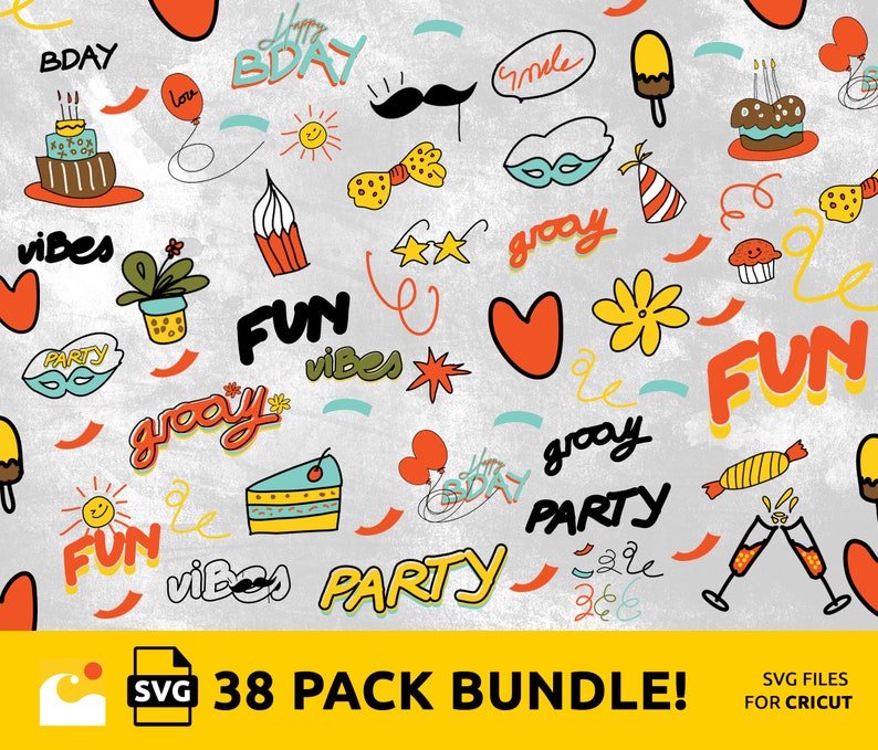 You will receive a ZIP file of Retro Birthday Doodle Clip Art, Hand Drawn Birthday Party SVG designs, compatible with programs like Cricut, Silhouette Designer Edition, and more.